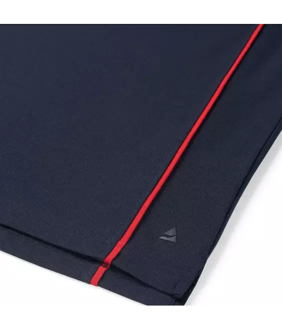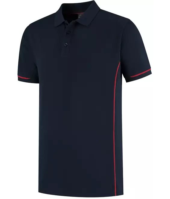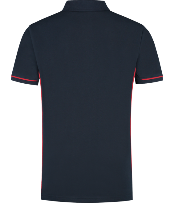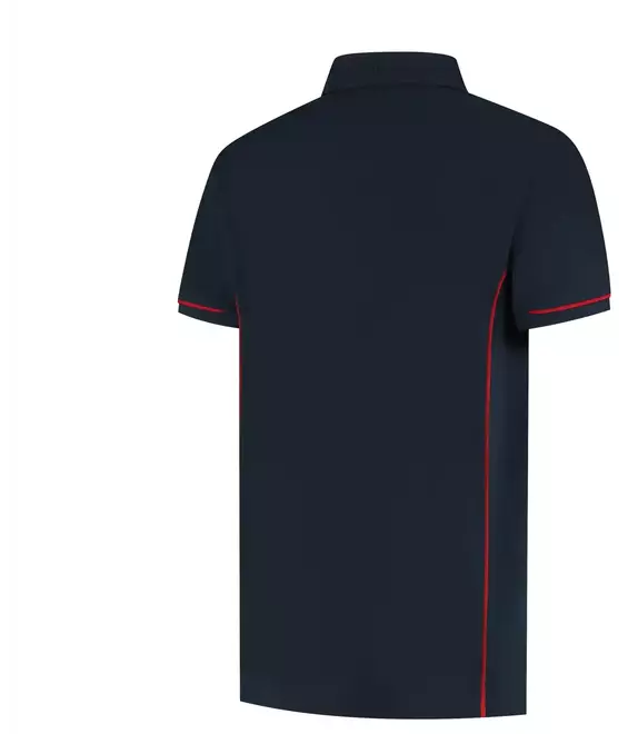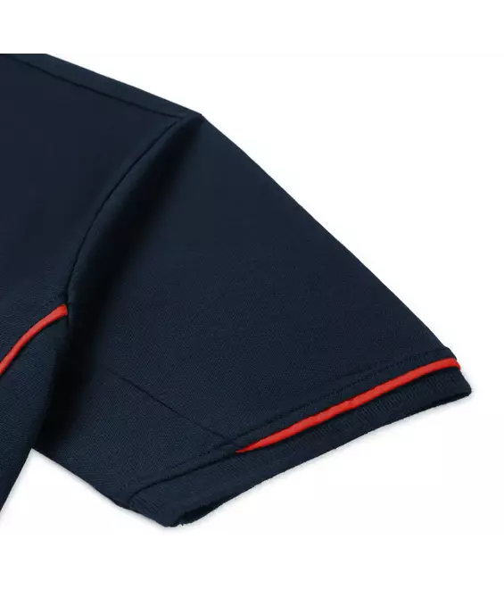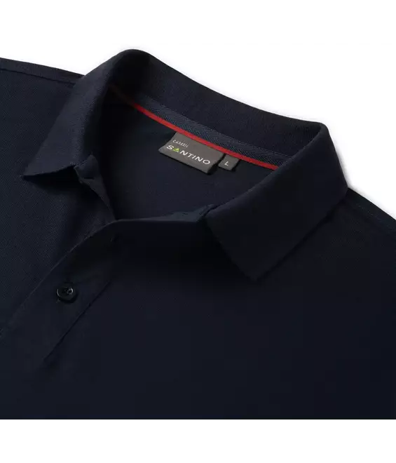 Polo, 50% polyester recyclé / 48% coton biologique / 2% élasthanne, certifié GRS, 210 g/m², piqué, unisexe, coupe moderne, passepoil contrasté, col polo plat avec bord-côte, patte de boutonnage 3 boutons, manches courtes avec bords-côtes 1x1 et transfert du logo Santino 3D sur le dessous.