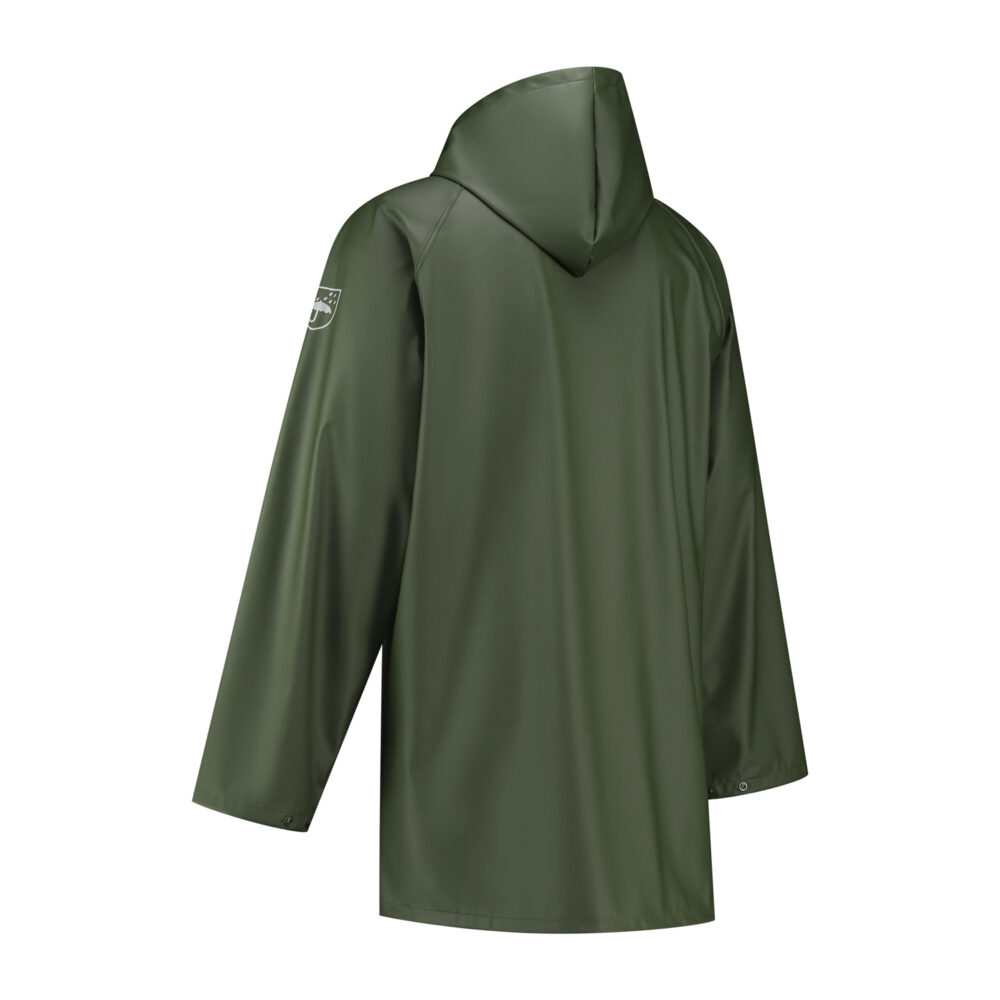 Regenjas PU, drukknoopsluiting met stormflap, capuchon, 2 steekzakken logo normering op linkermouw, steldrukkers mouwen
