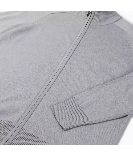 Zip cardigan, 50% katoen / 50% acrylic, 12 gauge breisel, +/- 350 gr/st (size M), ladies fit, opstaande 2x2 ribkraag en verdekte metalen YKK rits, raglan mouw inzet, mouw met ribmanchet en tailleband in 2x2 rib.